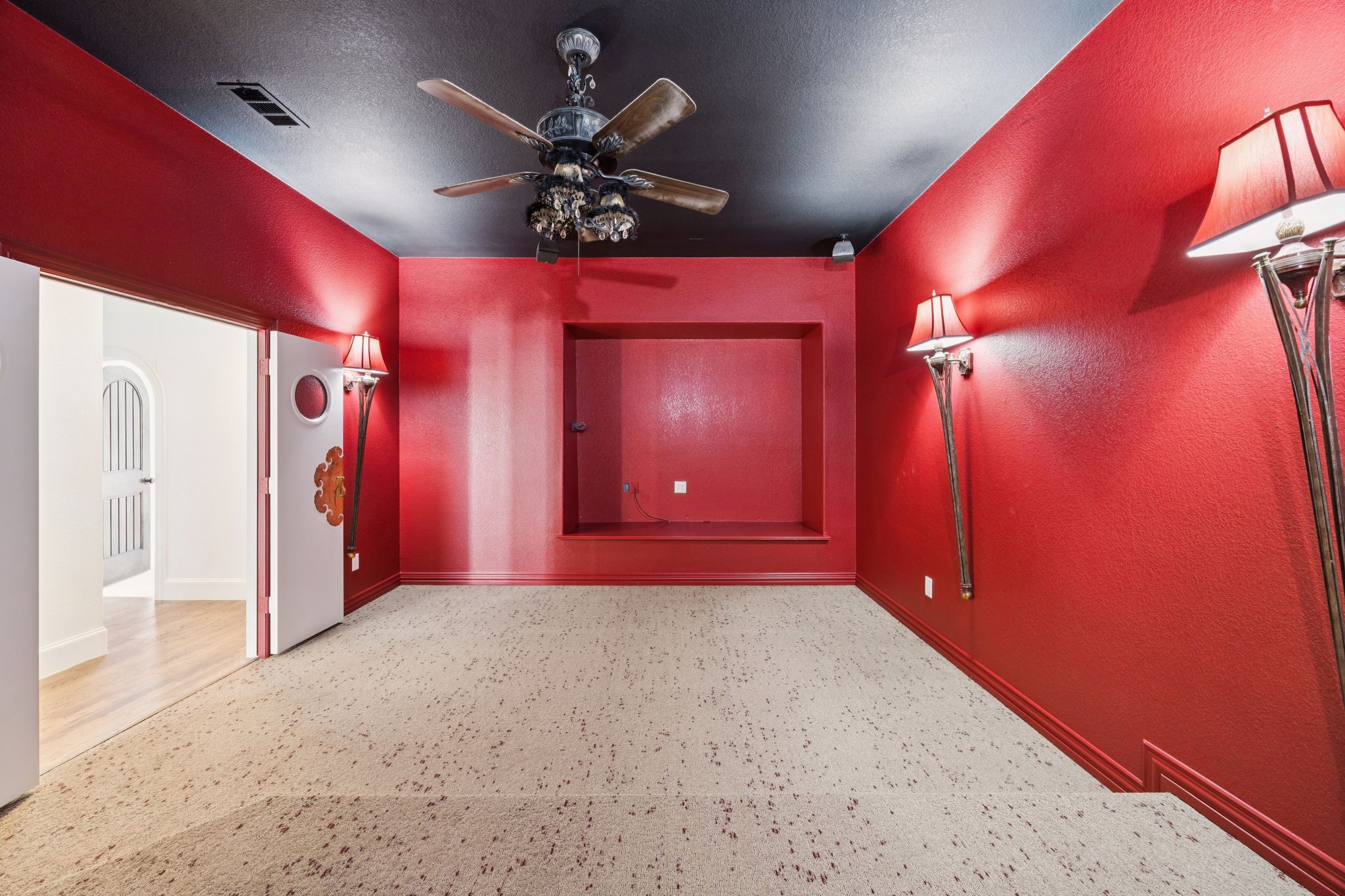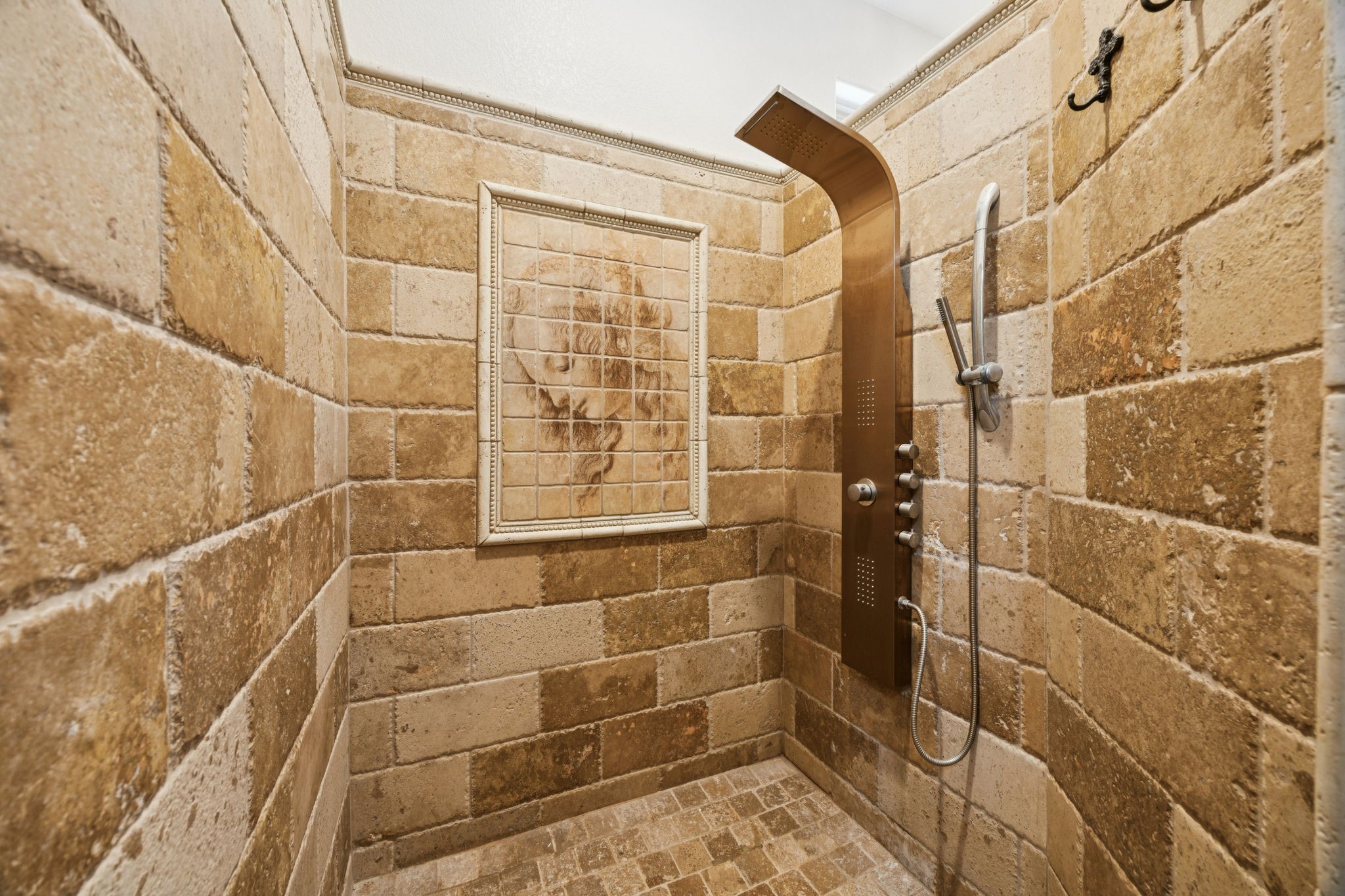 Step outside to your private backyard oasis featuring a 15,000-gallon custom heated pool, hot tub, grotto, and waterfall, all enclosed by a wrought-iron fence that belongs to this property.
