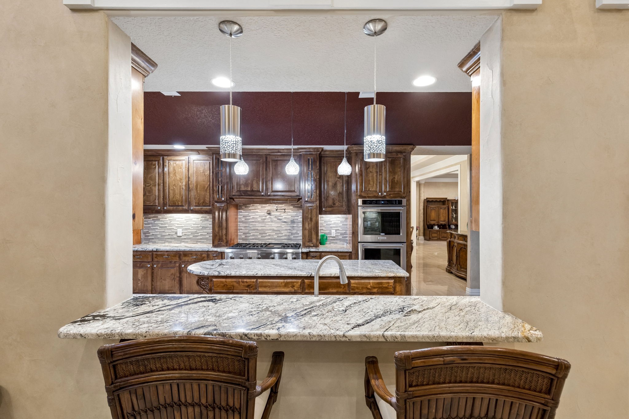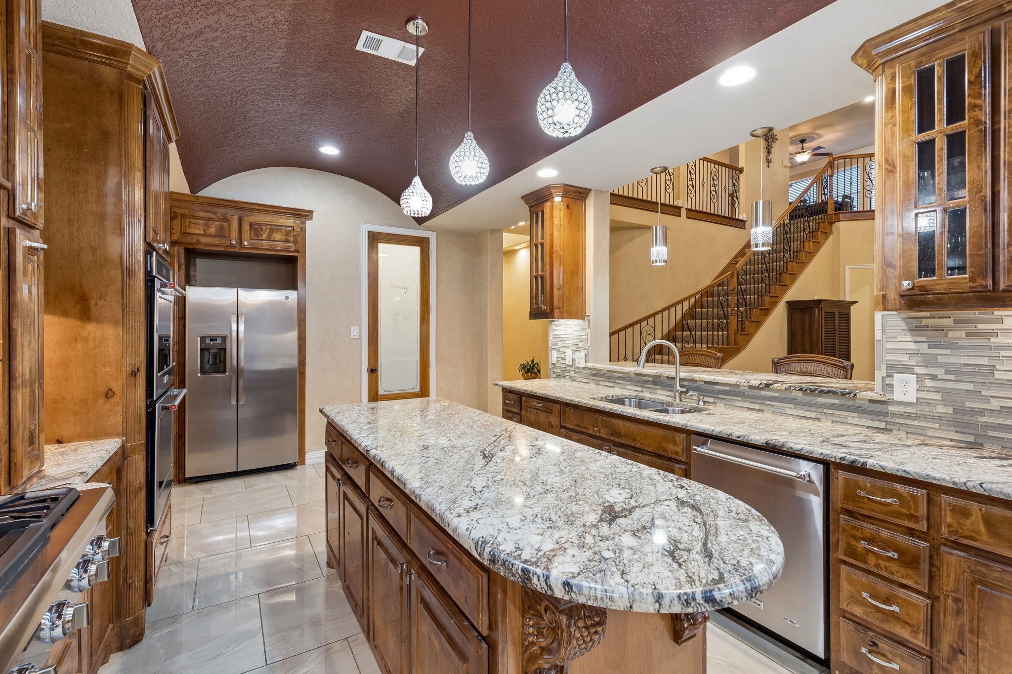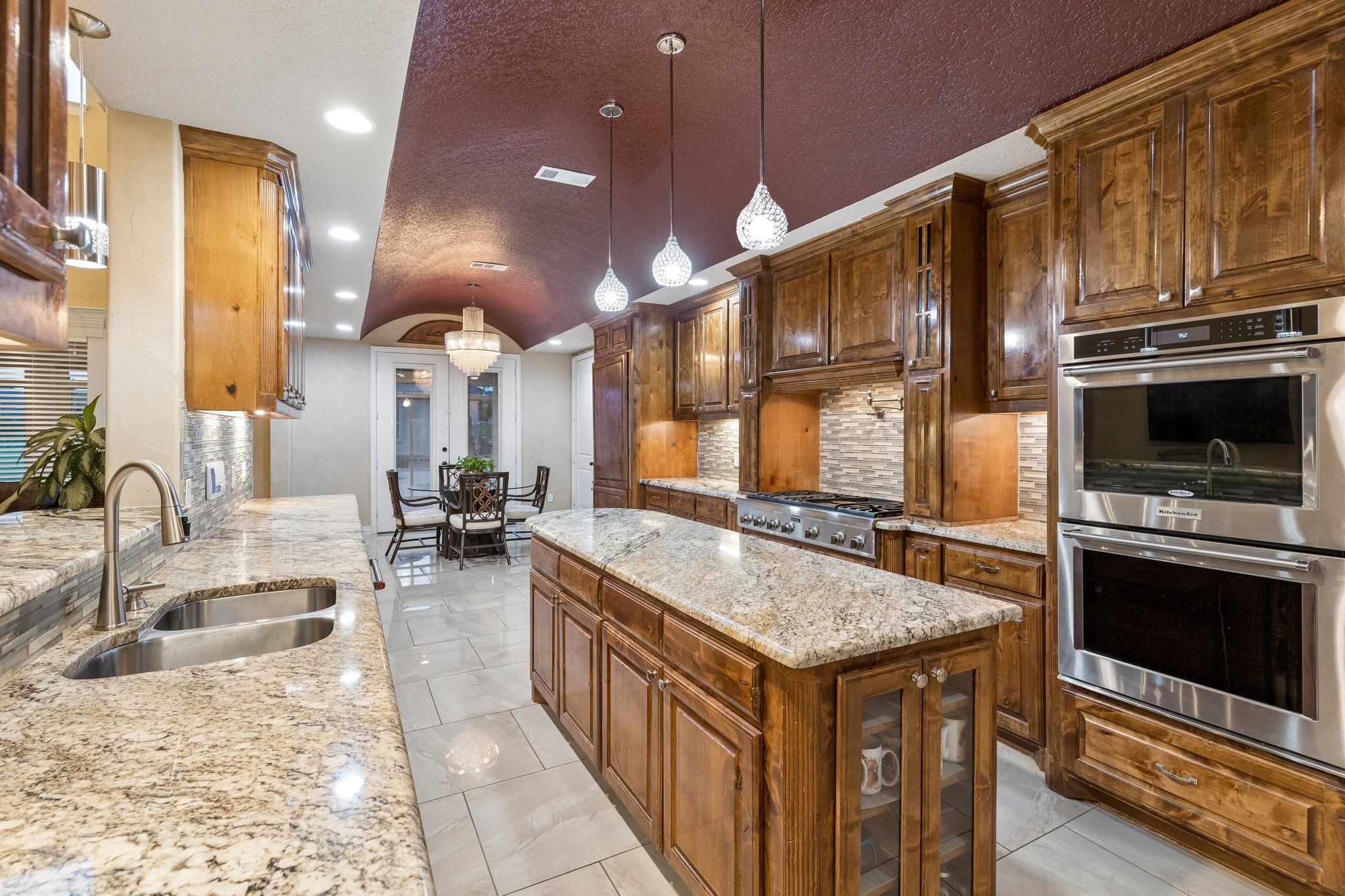 The chef's kitchen is a true centerpiece, complete with a 6-burner Thermador gas range, pot filler, double ovens, oversized island, and an expansive walk-in pantry, designed for both entertaining and everyday living.