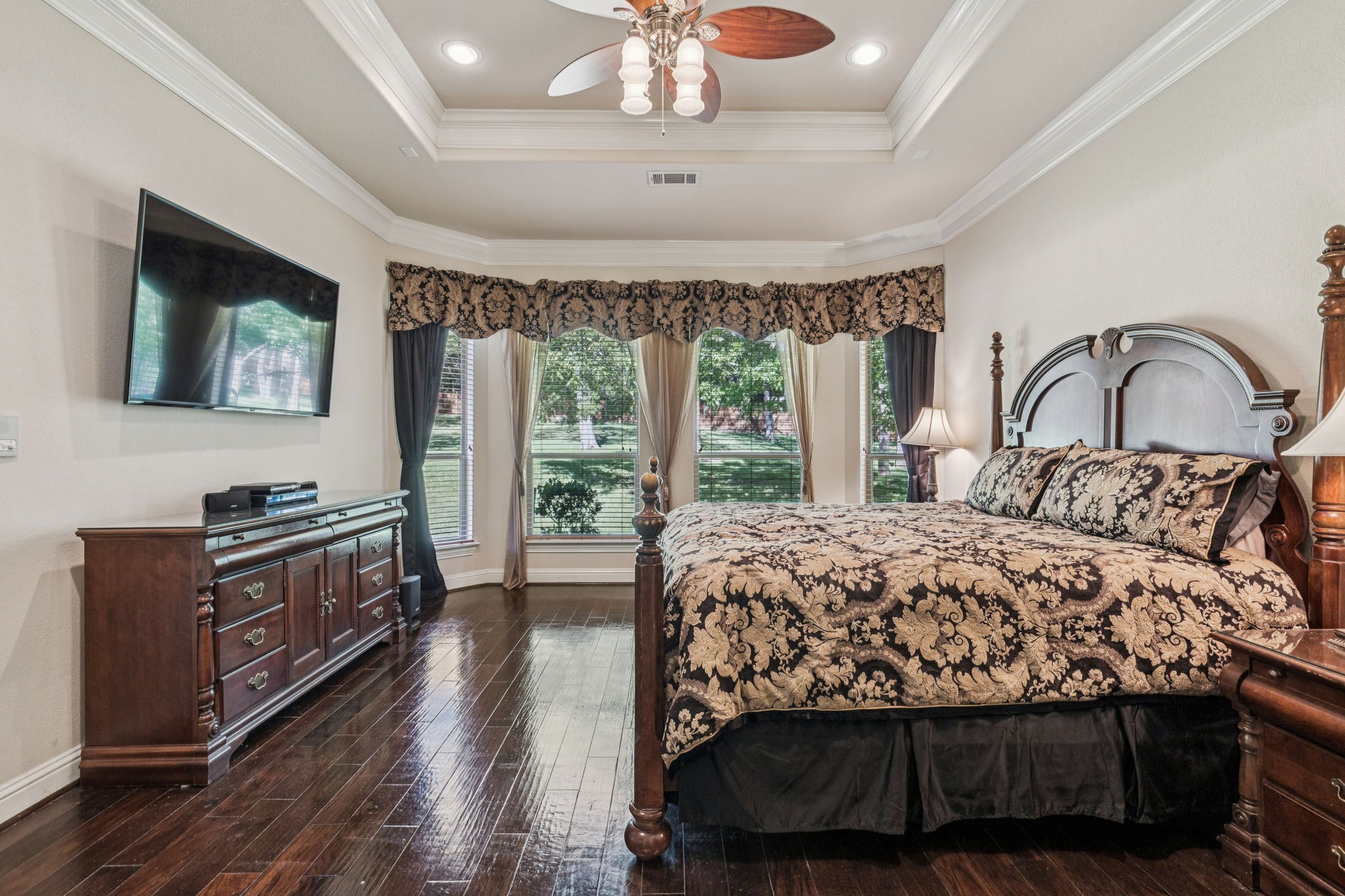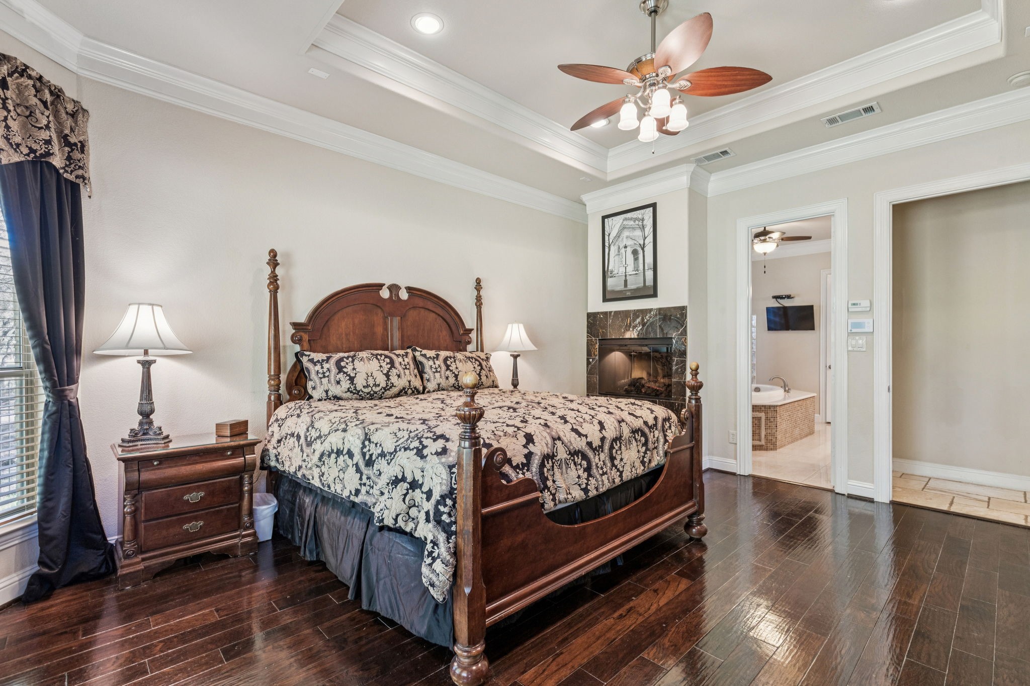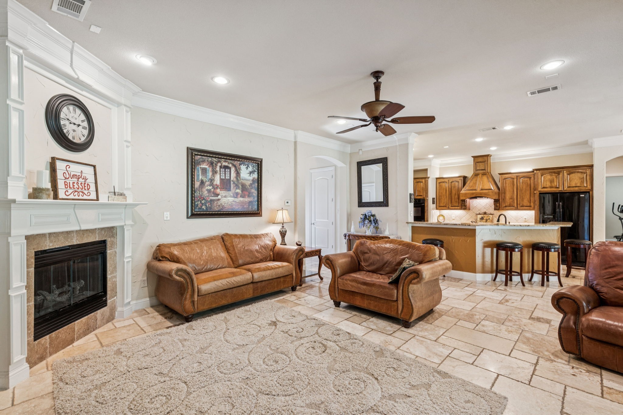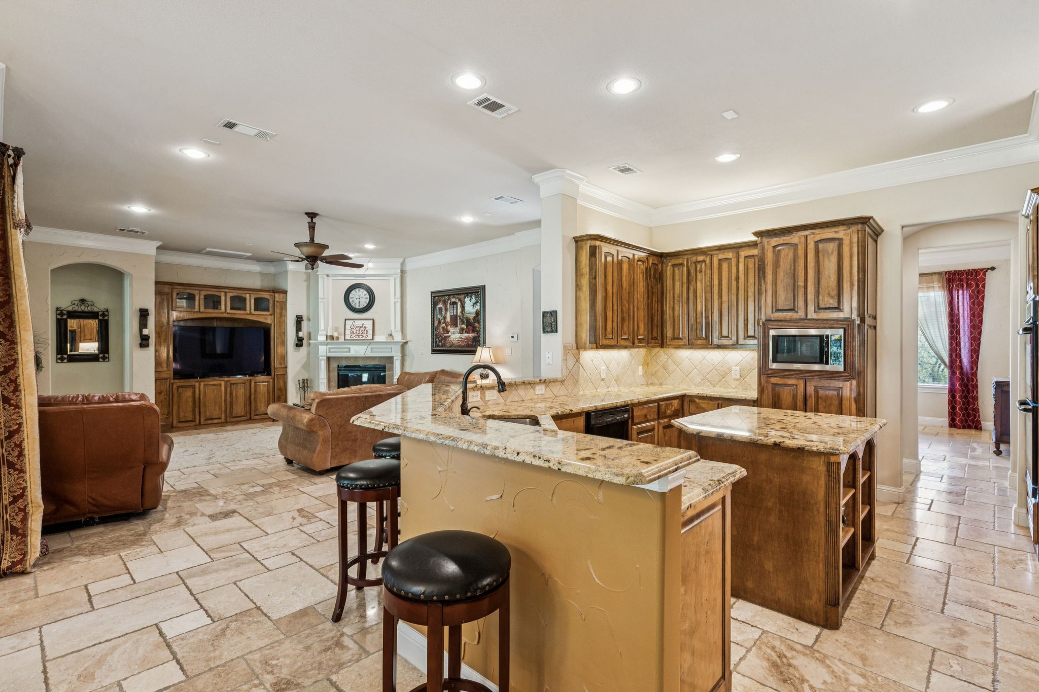 New roof installed July 2025. This stunning 2-story custom home blends luxury and comfort with exceptional craftsmanship throughout. Featuring 4 bedrooms, 4 full baths, and a 3-car garage, this residence offers space, style, and flexibility for any lifestyle. From the moment you enter, you're greeted with beautiful views from the front door, an impressive curved staircase, hand-scraped hardwood floors, and hand-troweled walls. The executive-style office stands out with a wood-beamed ceiling, custom built-ins, and a bay window showcasing scenic views, perfect for working from home. Entertainment spaces abound, including a cinema-style media room and a large game room complete with a granite wet bar and custom shelving. The chef's kitchen includes a butler's pantry and flows seamlessly into a spacious living area with soaring ceilings and designer finishes. The owner's retreat is a true luxury escape with a see-through fireplace, spa-like bath, oversized jetted tub, and a massive double walk-in shower. A private secondary bedroom and bath are located downstairs, with two additional bedrooms and the media room upstairs, offering the perfect balance of privacy and convenience. Additional highlights include travertine flooring, a mud room, and an impressive front entry door. The property offers both a large front yard and backyard, ideal for entertaining or relaxation.