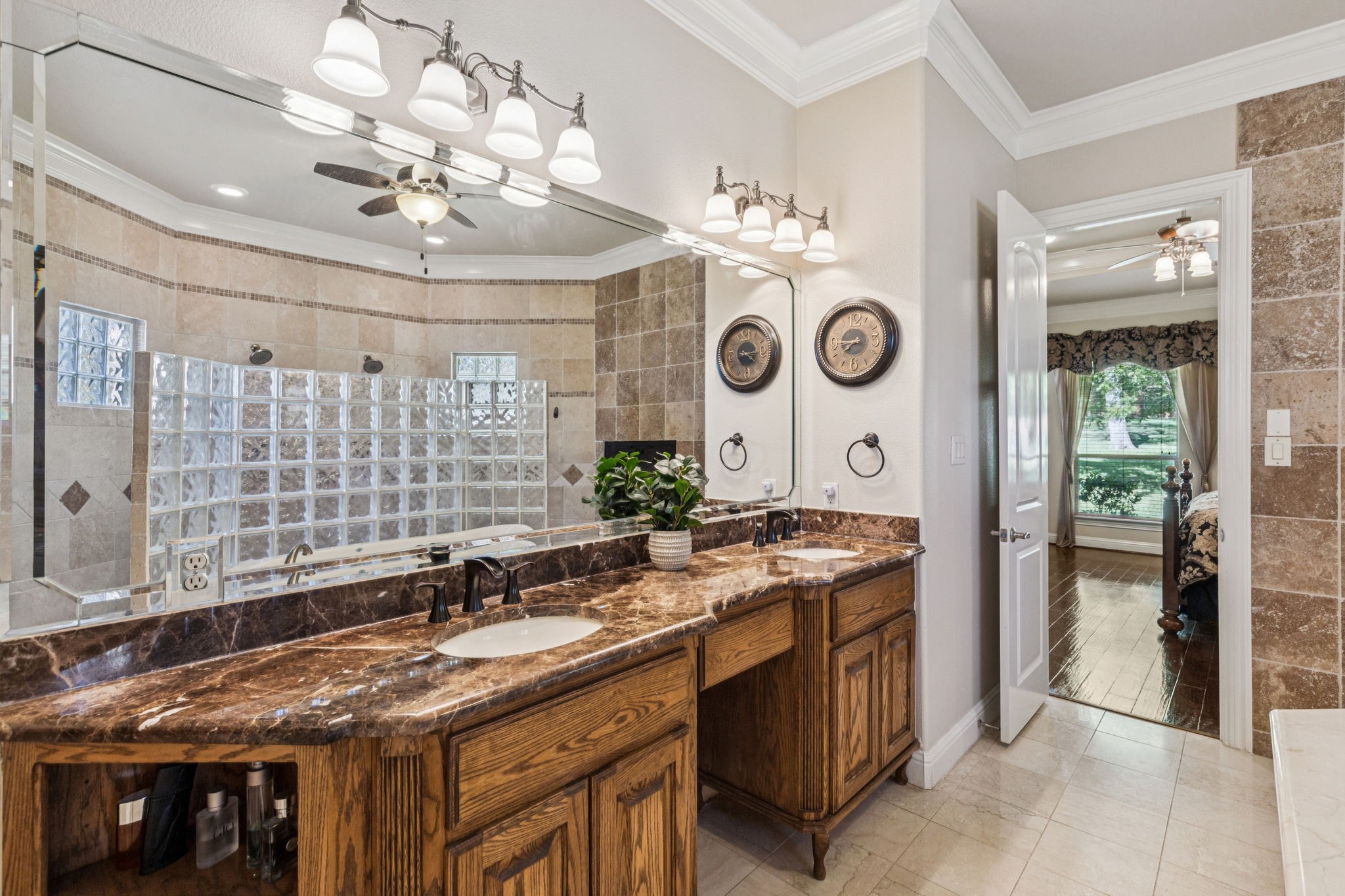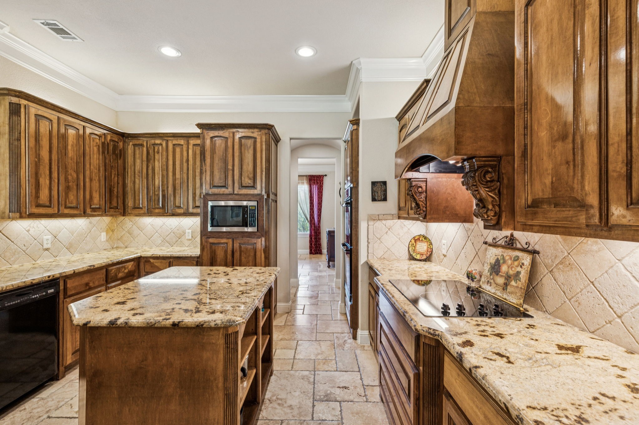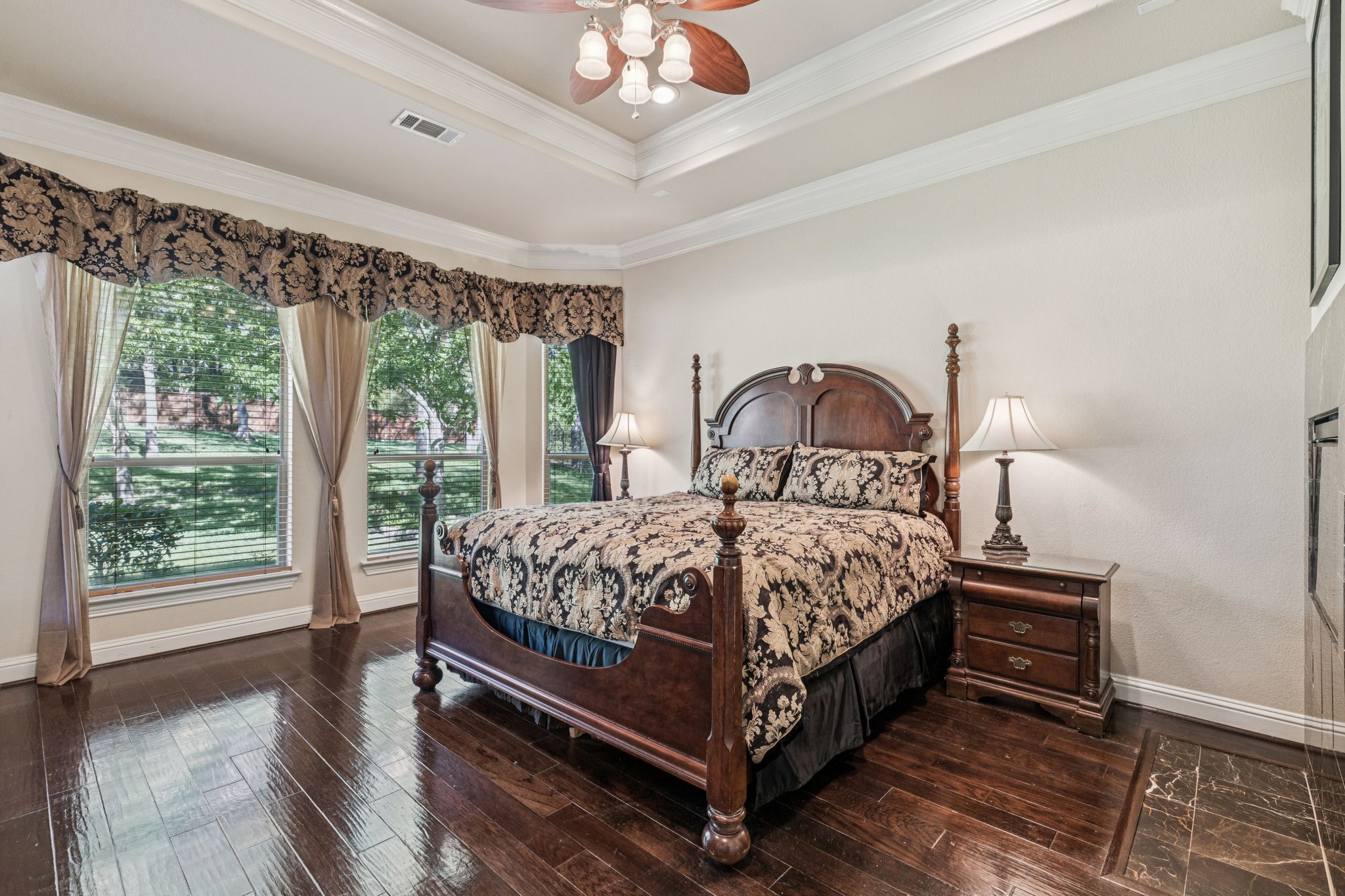 New roof installed July 2025. This stunning 2-story custom home blends luxury and comfort with exceptional craftsmanship throughout. Featuring 4 bedrooms, 4 full baths, and a 3-car garage, this residence offers space, style, and flexibility for any lifestyle. From the moment you enter, you're greeted with beautiful views from the front door, an impressive curved staircase, hand-scraped hardwood floors, and hand-troweled walls. The executive-style office stands out with a wood-beamed ceiling, custom built-ins, and a bay window showcasing scenic views, perfect for working from home. Entertainment spaces abound, including a cinema-style media room and a large game room complete with a granite wet bar and custom shelving. The chef's kitchen includes a butler's pantry and flows seamlessly into a spacious living area with soaring ceilings and designer finishes. The owner's retreat is a true luxury escape with a see-through fireplace, spa-like bath, oversized jetted tub, and a massive double walk-in shower. A private secondary bedroom and bath are located downstairs, with two additional bedrooms and the media room upstairs, offering the perfect balance of privacy and convenience. Additional highlights include travertine flooring, a mud room, and an impressive front entry door. The property offers both a large front yard and backyard, ideal for entertaining or relaxation.