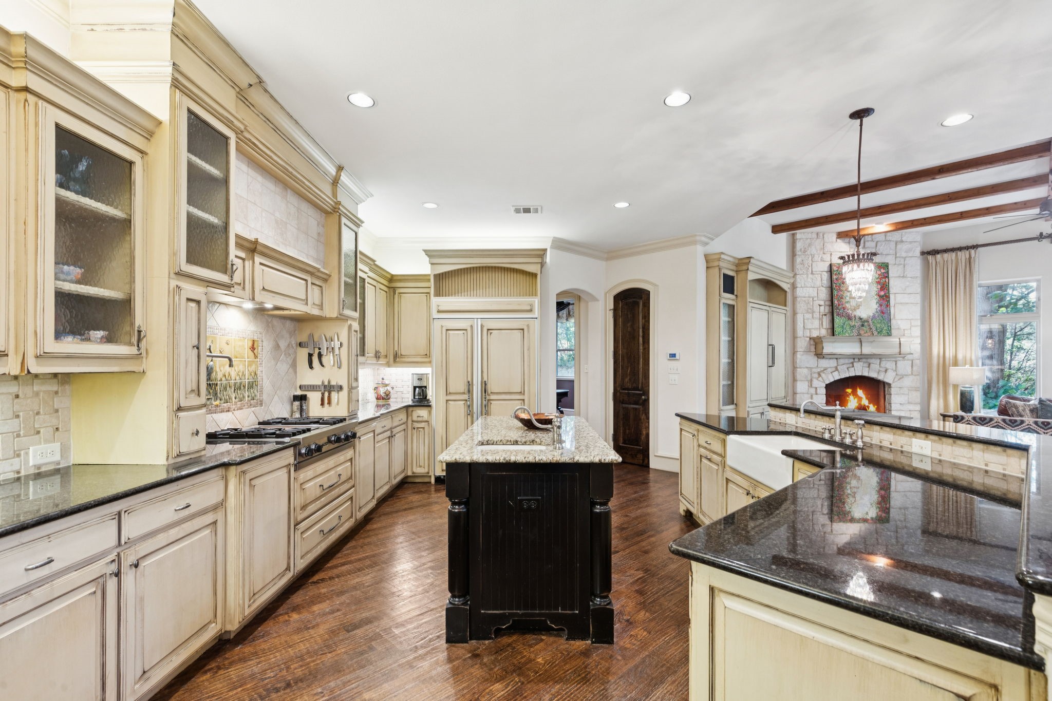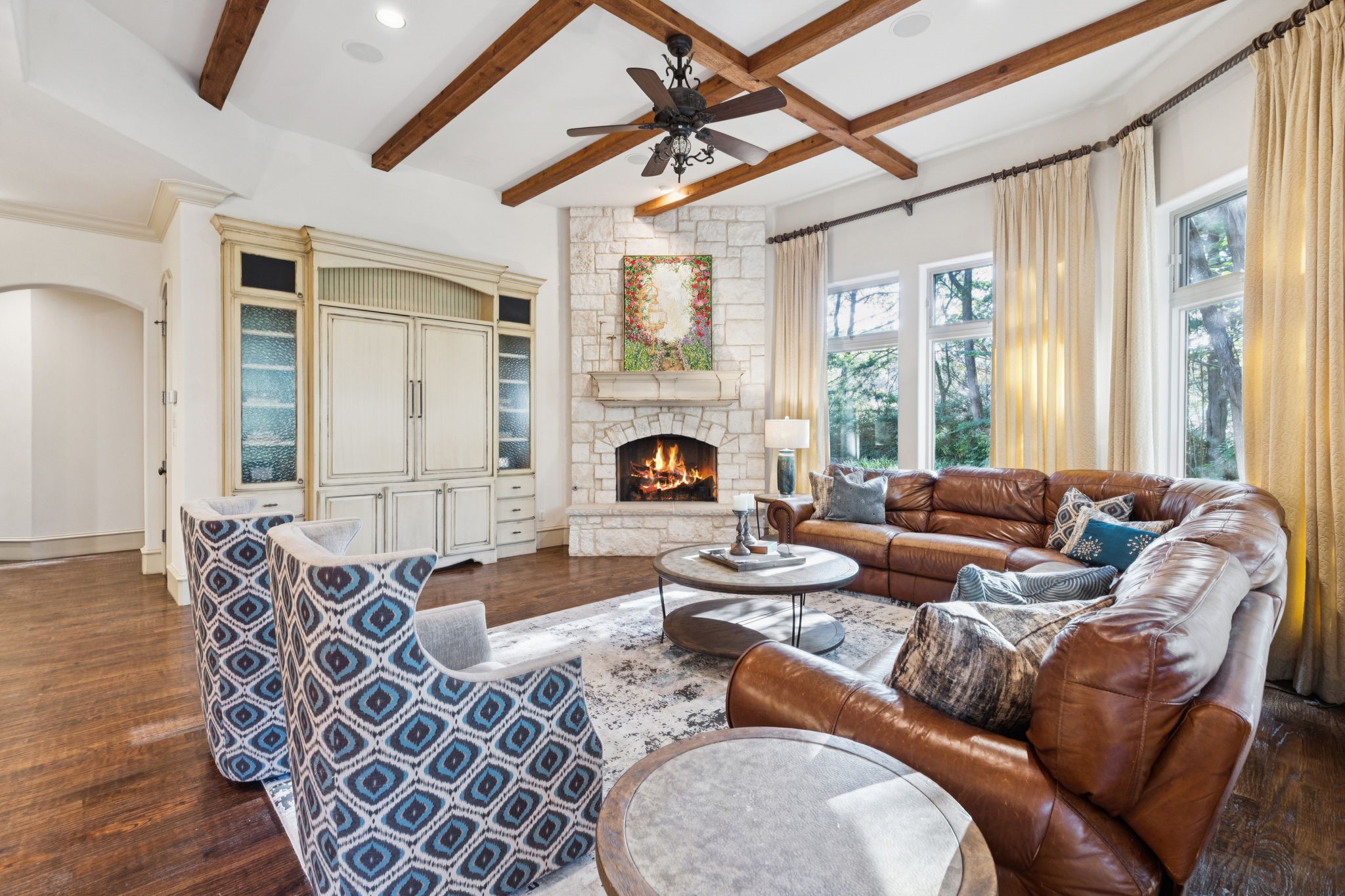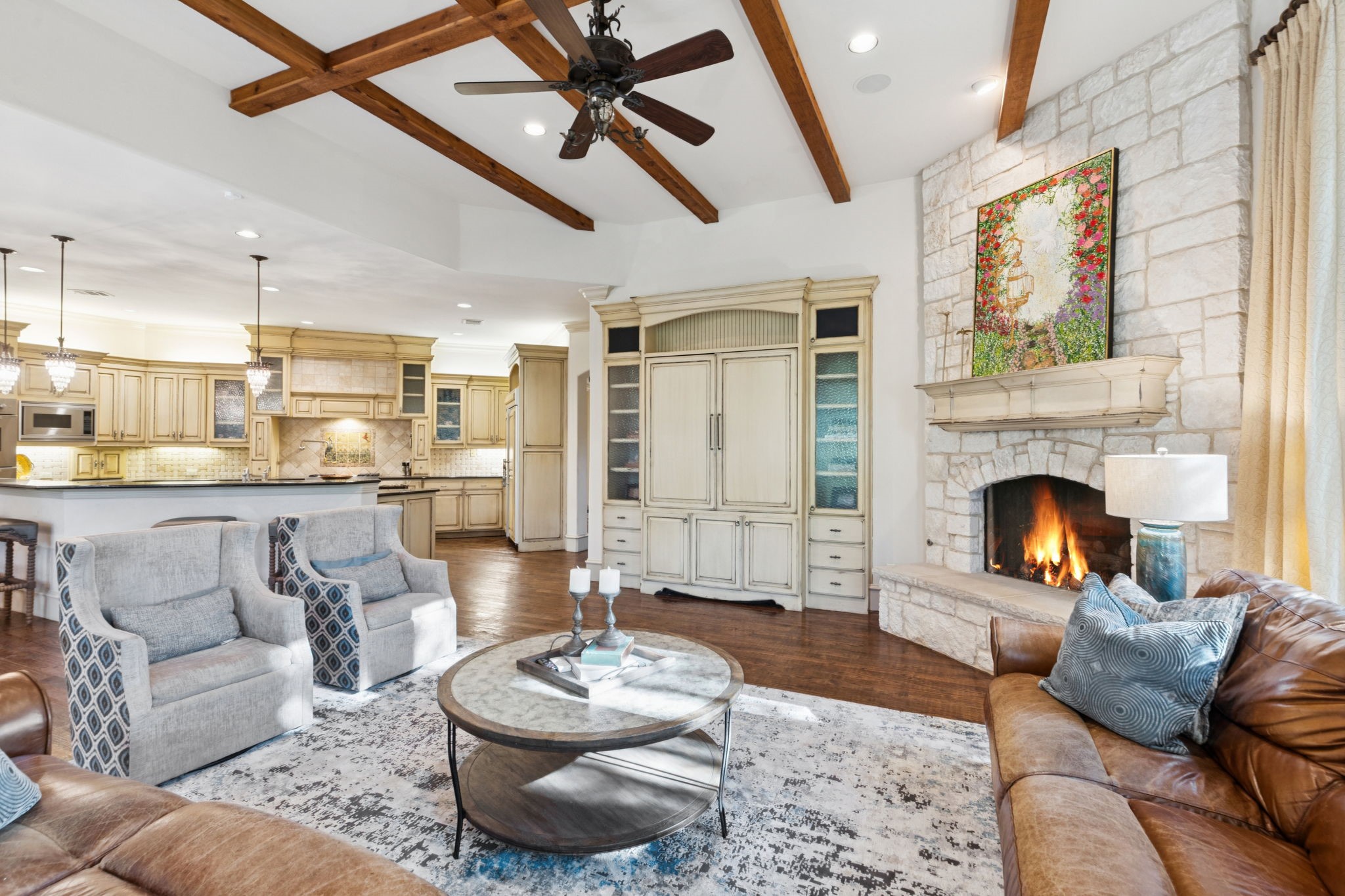 At the heart of the home, the chef's kitchen stands out with Viking appliances, double ovens, gas cooktop with pot filler, farm sink, island, breakfast bar, and built-in refrigerator -- all overlooking the open living space with its coffered ceiling, cozy fireplace, and serene backyard views.