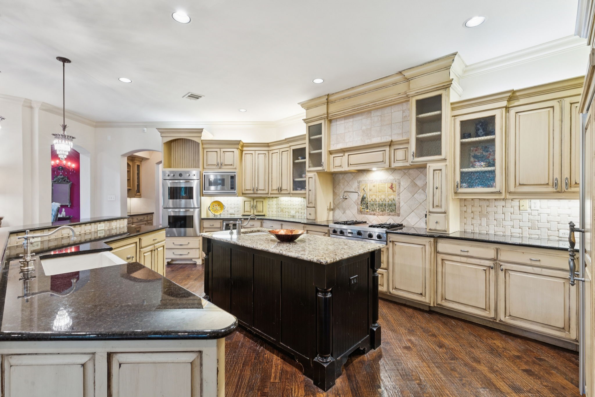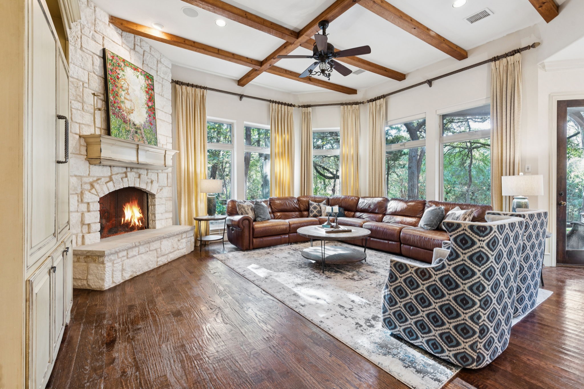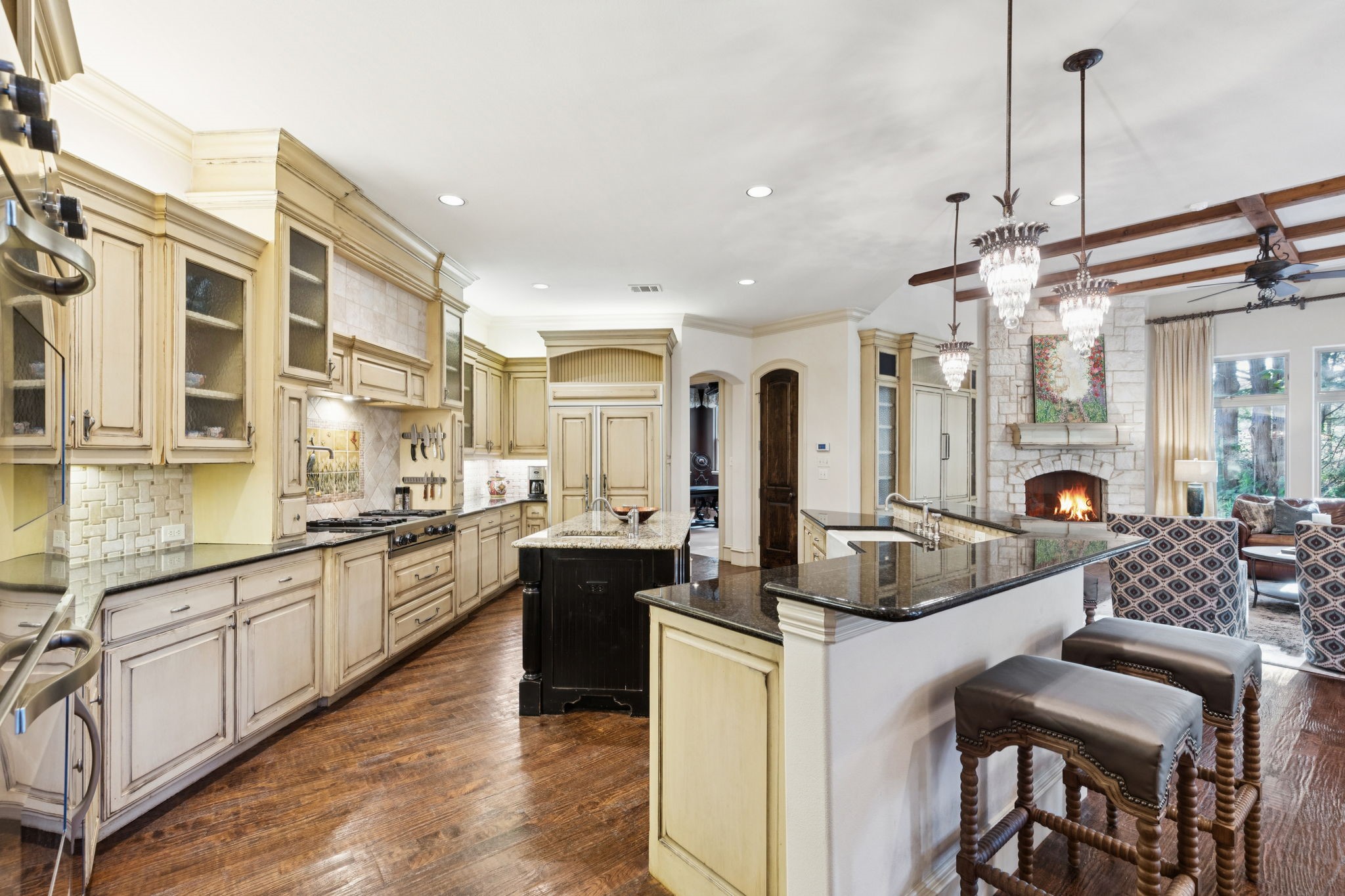At the heart of the home, the chef's kitchen stands out with Viking appliances, double ovens, gas cooktop with pot filler, farm sink, island, breakfast bar, and built-in refrigerator -- all overlooking the open living space with its coffered ceiling, cozy fireplace, and serene backyard views.