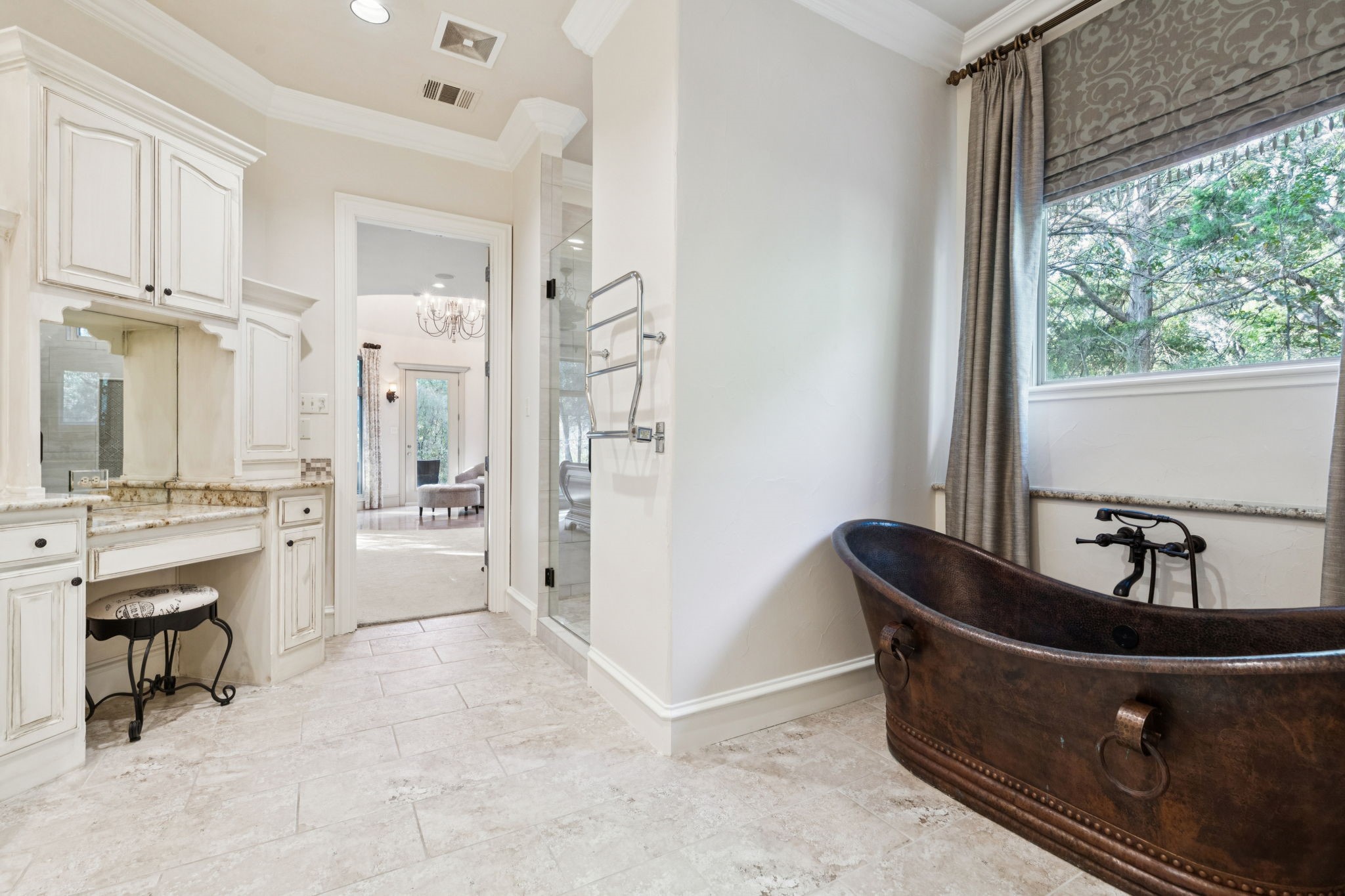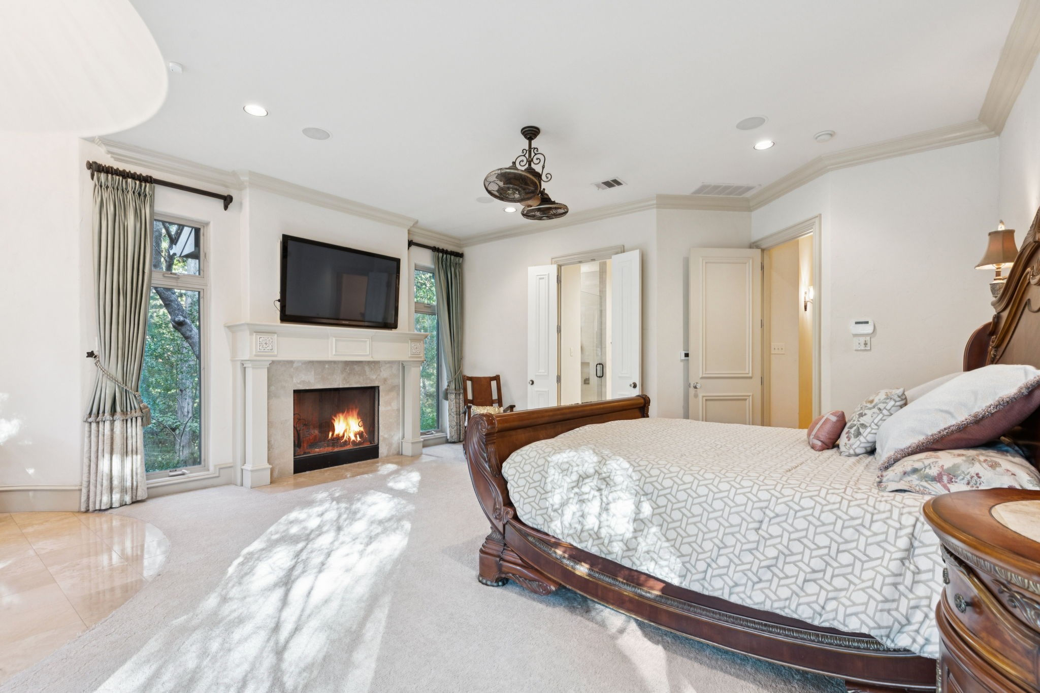 The primary suite is a private retreat featuring its own fireplace, a relaxing sitting area, and a spa-inspired bath with a copper freestanding tub, double copper sinks, multi-head shower, heated towel bars, and a huge walk-in closet.